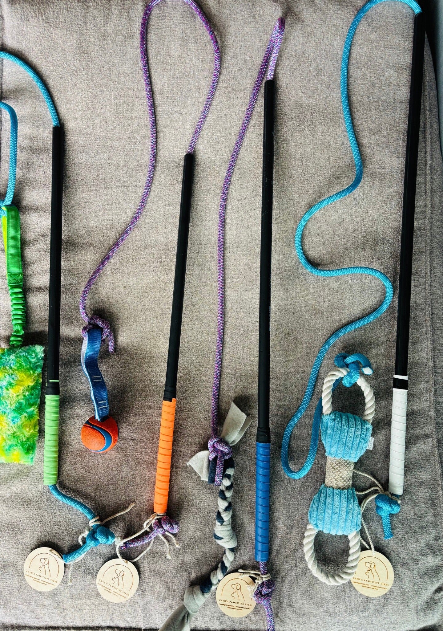 Mijn handgemaakte flirtpoles zijn volledig naar wens aan te passen: kies jouw favoriete kleuren, speeltje en koord, zodat het helemaal bij jullie past. 🎨✨